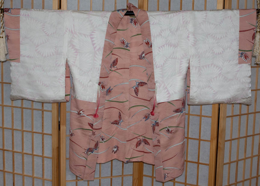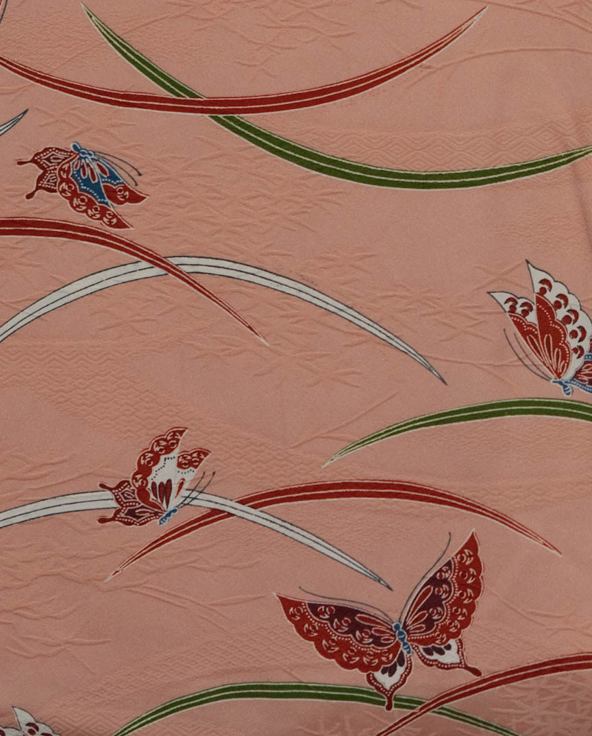 This Haori is made from exceptional peach colored silk with a woven design of bamboo branches and stylized fences. Over this base silk the artist deigned butterflies and stylized grasses using rice resist technique.