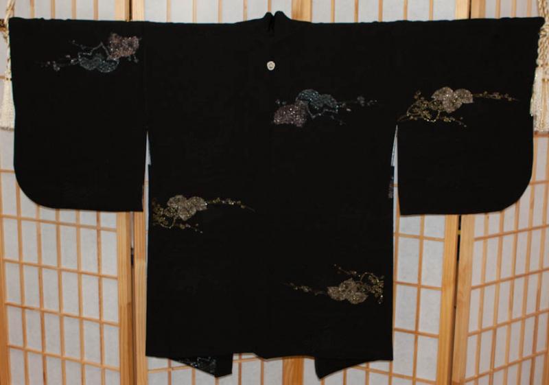 This elegant Haori is in perfect condition. It has the original ties, kumihimo, which can be easily removed if one so desires. Heavy weight black silk with woven design of water and reeds and flowers. The black silk is further embellished with gold, silver, blue and mauve threads. Family mon is located on the center of the upper back and is shown using rice resist technique. Lining is off white silk with a design of maple leaves outlined in deep purple color.