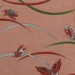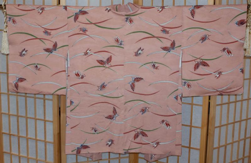 This Haori is made from exceptional peach colored silk with a woven design of bamboo branches and stylized fences. Over this base silk the artist deigned butterflies and stylized grasses using rice resist technique.