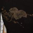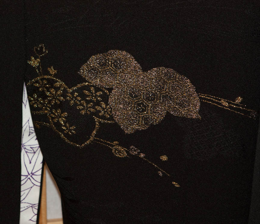 This elegant Haori is in perfect condition. It has the original ties, kumihimo, which can be easily removed if one so desires. Heavy weight black silk with woven design of water and reeds and flowers. The black silk is further embellished with gold, silver, blue and mauve threads. Family mon is located on the center of the upper back and is shown using rice resist technique. Lining is off white silk with a design of maple leaves outlined in deep purple color.